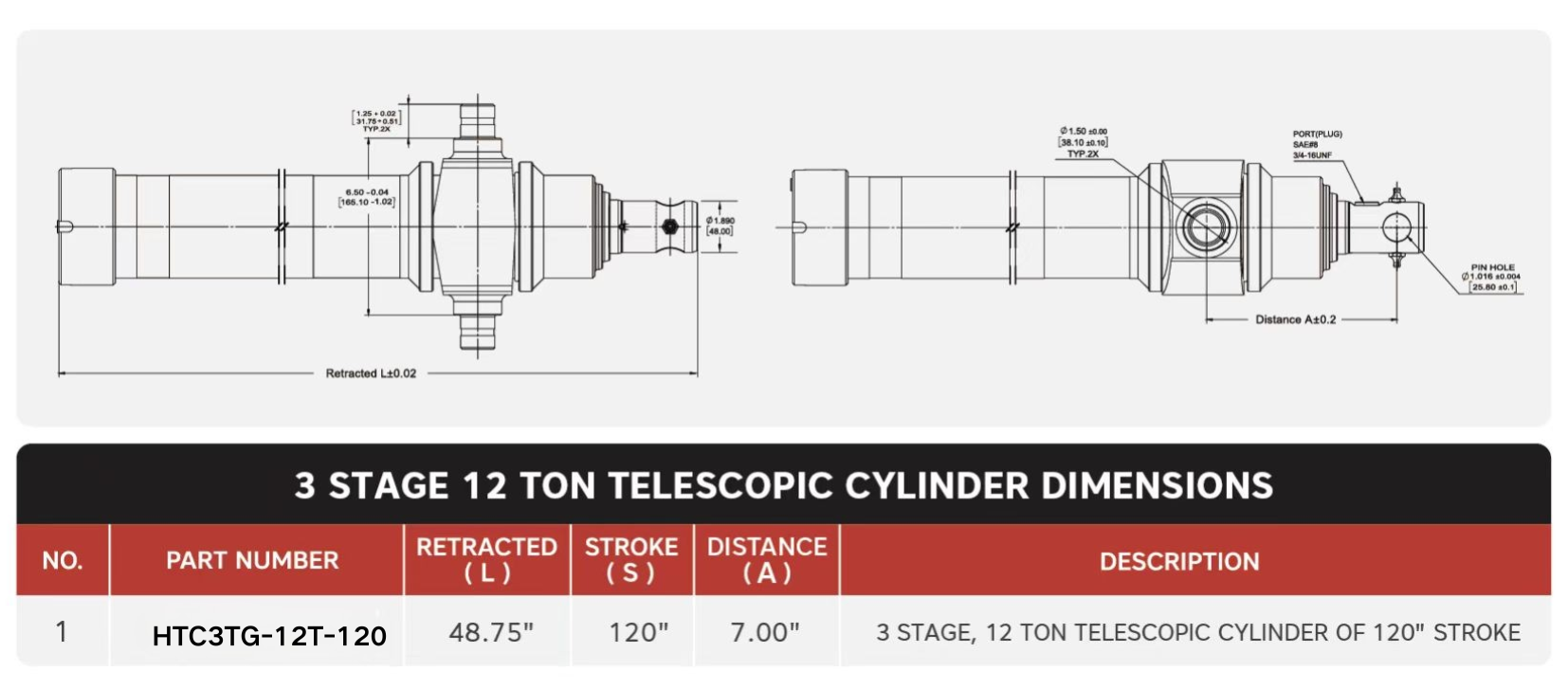 "HTC3TG-12T-120", 3 స్టేజ్, 12 టన్ ఆఫ్ 120" స్ట్రోక్ టెలిస్కోపిక్ సిలిండర్లు