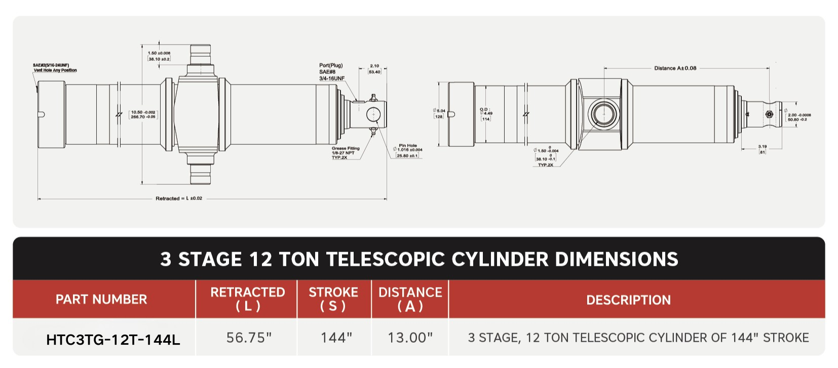 "HTC3TG-12T-144L", 3 స్టేజ్, 12 టన్ను 144" స్ట్రోక్ 13"ట్రూనియన్ డిస్టెన్స్ టెలిస్కోపిక్ సిలిండర్లు