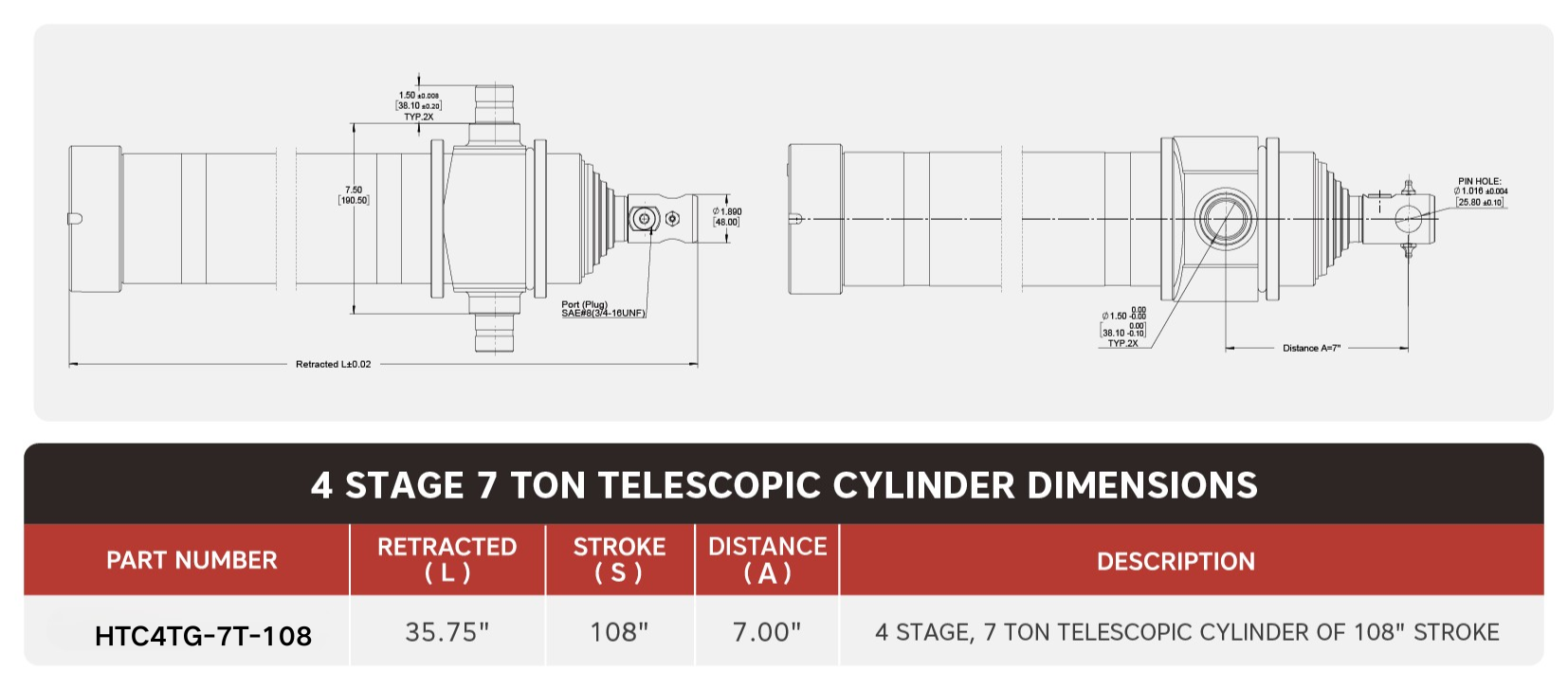 "HTC4TG-7T-108", 4 స్టేజ్, 7 టన్ ఆఫ్ 108" స్ట్రోక్ టెలిస్కోపిక్ సిలిండర్